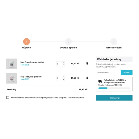 Im linken Teil des ersten Schrittes der Bestellung befindet sich eine klassische Zusammenfassung der bestellten Produkte einschließlich des Preises, der Menge und der Information über den Lagerbestand. Im rechten Teil befindet sich ein Standardfeld für Geschenkgutscheine. Der Platz eignet sich zum Aufhängen anderer Module, die mit den Bestellinformationen zusammenhängen, wie z.B. das Modul "Restposten für kostenlosen Versand".