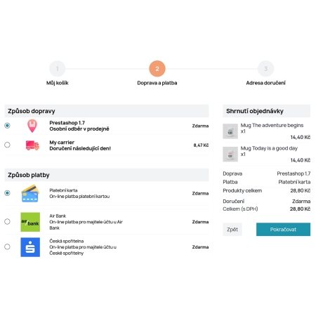 Dieses Prestashop-Modul ändert den Standard-Kaufprozess in einen einfachen und klaren dreistufigen Prozess. Dadurch wird es für den Kunden schneller und intuitiver, den Kaufprozess zu durchlaufen, was die Wahrscheinlichkeit erhöht, dass er die Bestellung abschließt. Ein solcher Bestellprozess ermöglicht auch eine detaillierte Messung des Kundenverhaltens bei jedem Schritt dank der Möglichkeit der fortgeschrittenen Integration von Analysetools für jeden Schritt der Bestellung.