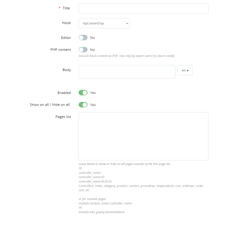 Administrable blocks are used to insert your own content on the e-shop into preset regions. Simply create your content using the WYSIWYG editor and select the correct location (hook).