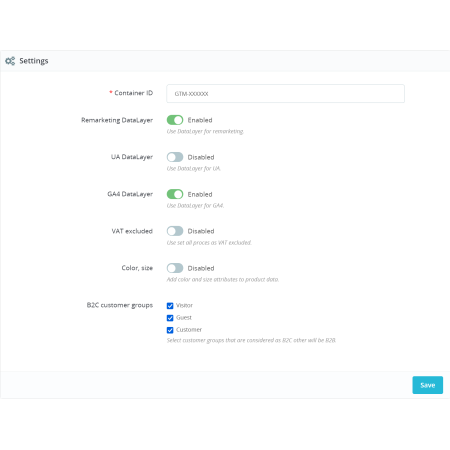 The module has ready-made data layers for Remarketing, the original Google Analytics and the new GA4.