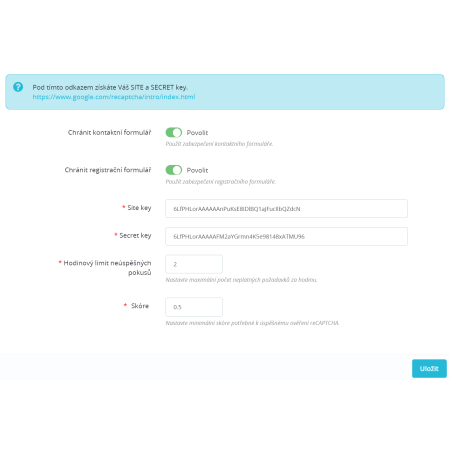 Nasz moduł implementuje reCAPTCHA bezpośrednio w systemie i zapewnia ochronę nie tylko dla ogólnych komentarzy lub loginów, ale w szczególności dla formularzy kontaktowych i rejestracyjnych, które są najczęstszym celem spamu. Dzięki temu baza danych pozostaje czysta, a klienci mają pewność, że komunikują się w bezpiecznym środowisku. Moduł pozwala ustawić wynik w zakresie 0-1, który określa, jak surowo system powinien oceniać zachowanie użytkownika - niższa wartość oznacza większą tolerancję, podczas gdy wyższa oznacza bardziej rygorystyczną ocenę